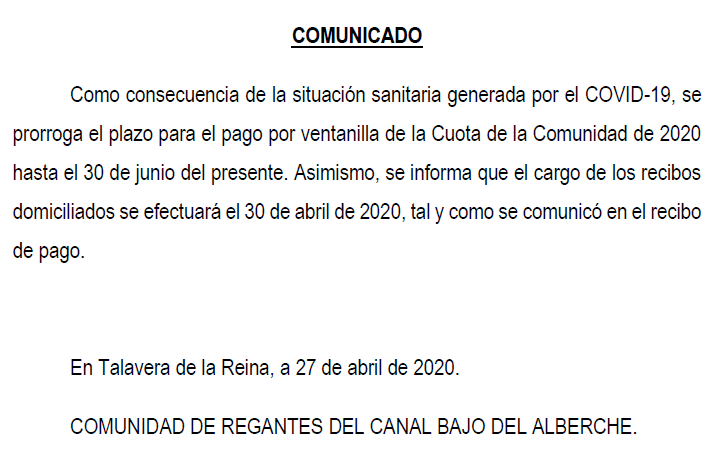 Como consecuencia de la situación sanitaria generada por el COVID-19 y lo acordado en el Real Decreto 463/2020, por el que se declara el estado de alarma, siguiendo las recomendaciones realizadas por las autoridades sanitarias y políticas, las oficinas de la Comunidad de Regantes permanecerán cerradas al público para evitar posibles contagios hasta nuevo aviso. Desde ellas seguiremos trabajando para los comuneros, por lo que pueden ponerse en contacto con nosotros, en horario de 8:00 a 14:30, en los siguientes teléfonos: