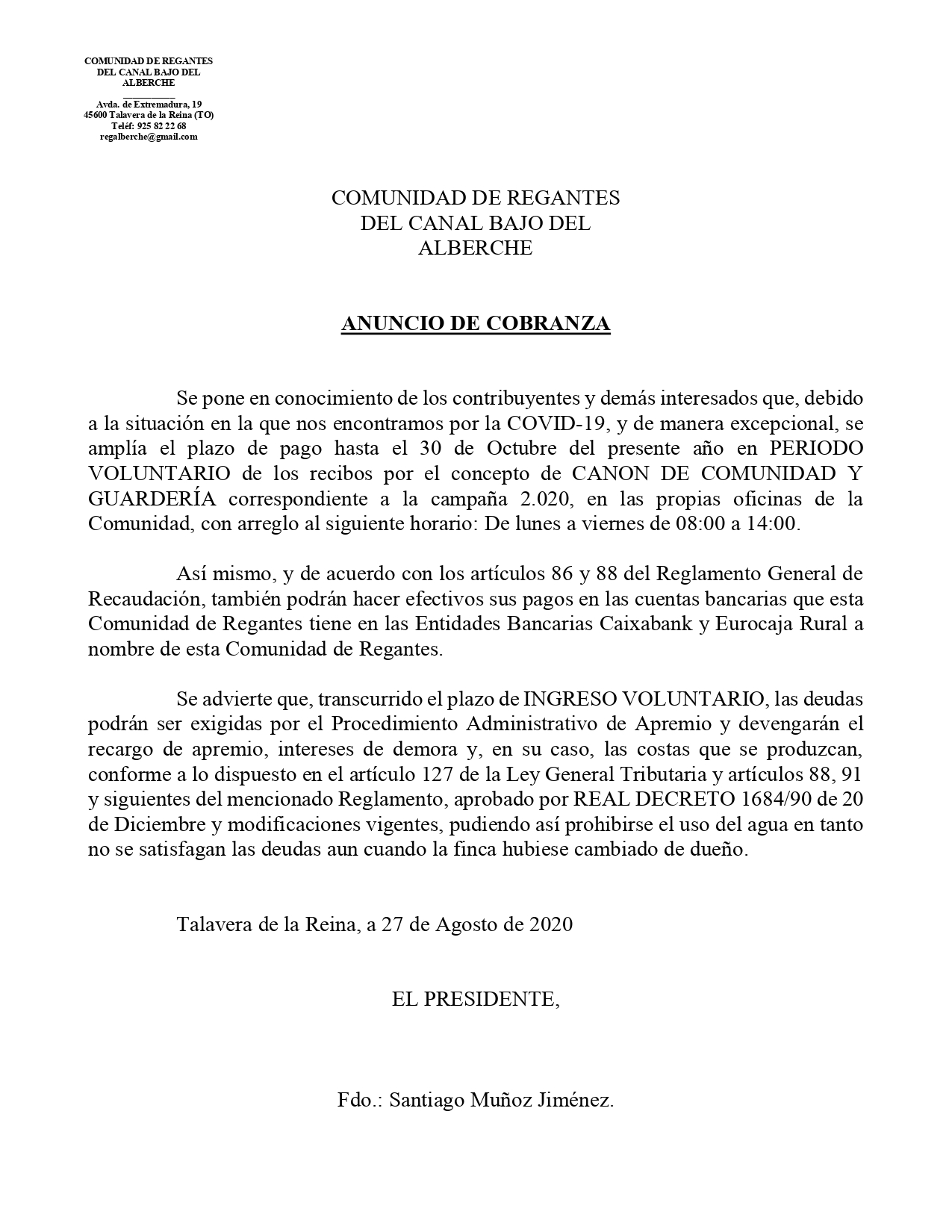 COMUNIDAD DE REGANTES DEL CANAL BAJO DEL ALBERCHE.